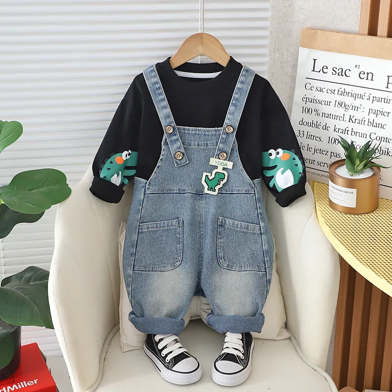 Un ensemble craquant avec une salopette en jean décorée d’une grenouille amusante et un t-shirt coloré, idéal pour un style à la fois fun et confortable.