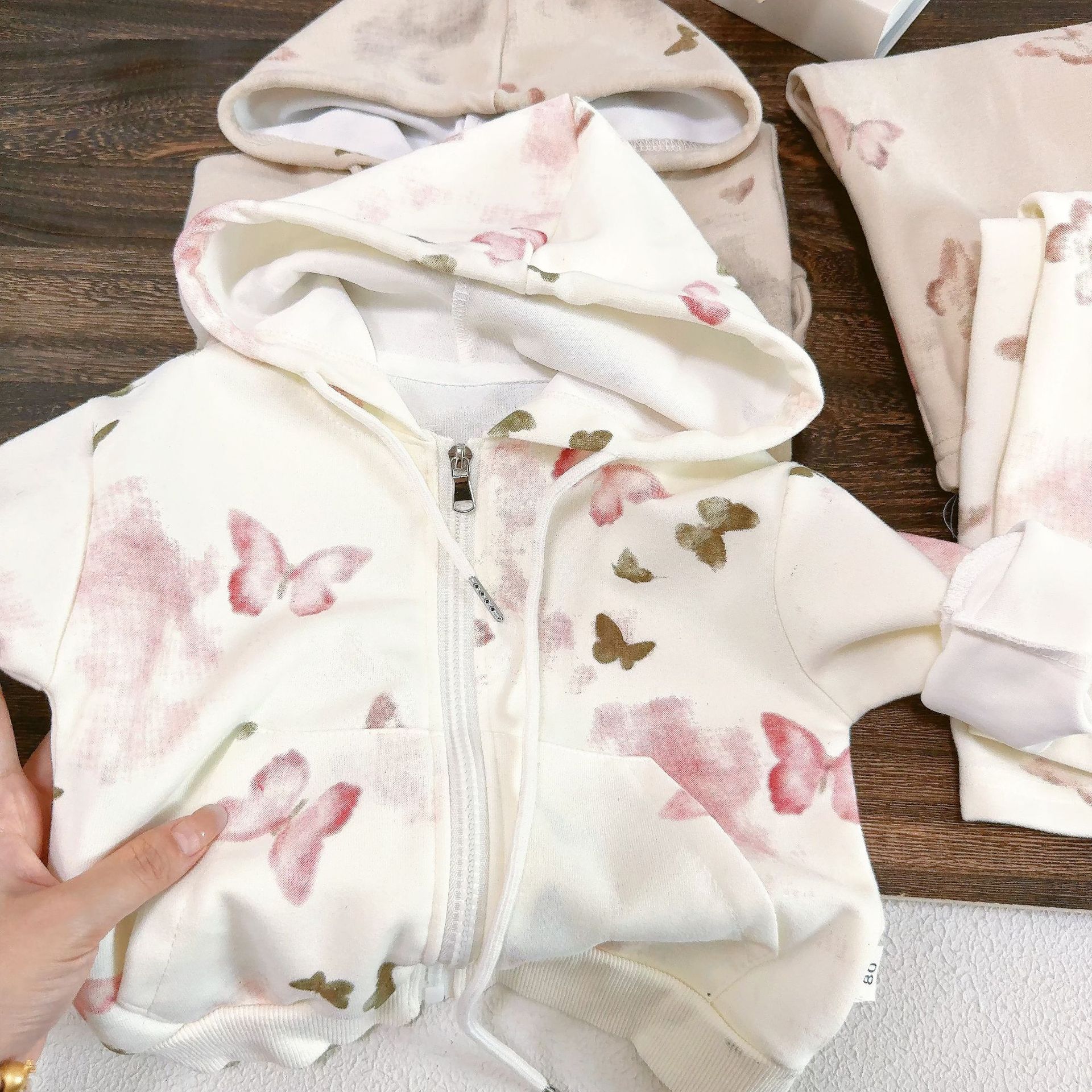 Ensemble fille blanc imprimé papillons rose avec capuche et pantalon.
