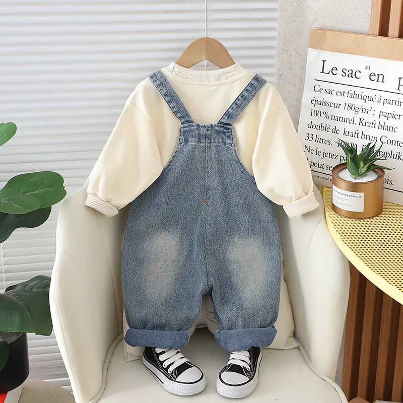 Version claire et tendance de l’incontournable salopette en jean, accompagnée d’un t-shirt beige. Confortable et stylé, cet ensemble est idéal pour un look pratique et chic. Disponible exclusivement sur MawloudDz.com.